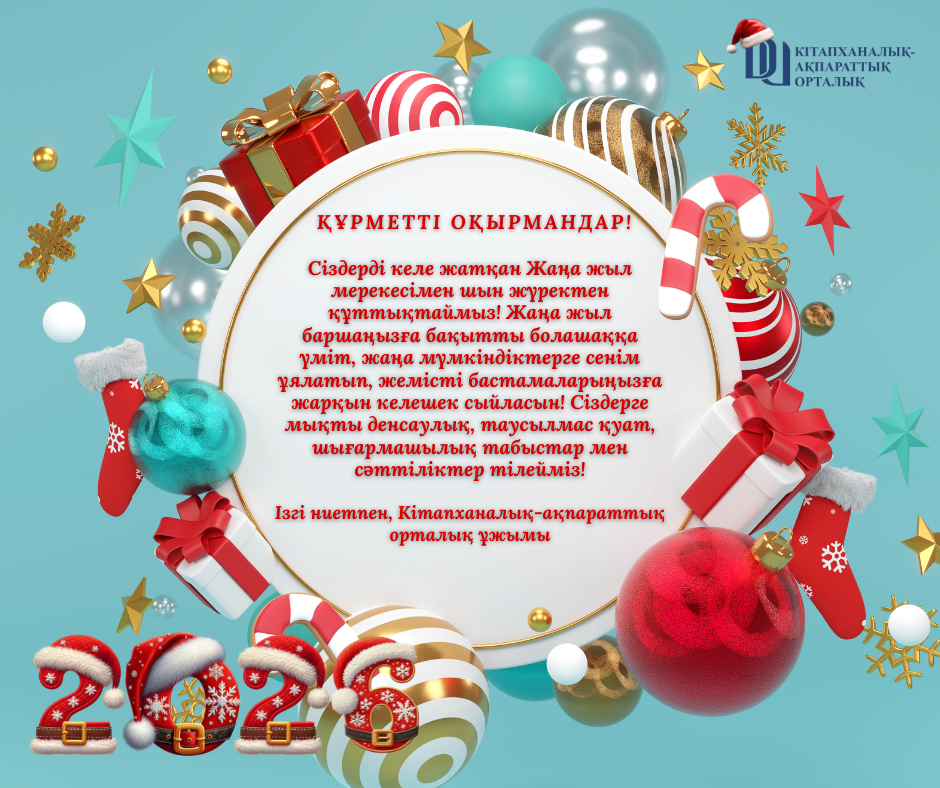 Сіздерді келе жатқан Жаңа жыл мерекесімен шын жүректен құттықтаймыз! Жаңа жыл баршаңызға бақытты болашаққа үміт, жаңа мүмкіндіктерге сенім ұялатып, жемісті бастамаларыңызға жарқын келешек сыйласын! Сіздерге мықты денсаулық, таусылмас қуат, шығармашылық табыстар мен сәттіліктер тілейміз!